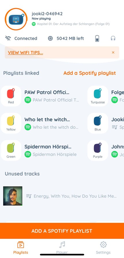 Ich starte eine Playlist bei Spotify und klicke auf das Gerätesymbol, die App schlägt mir Jooki als Wiedergabemedium vor. Und schon trällert sie los. Was mir sofort auffällt: Die Klangqualität ist viel besser als die einer Toniebox.