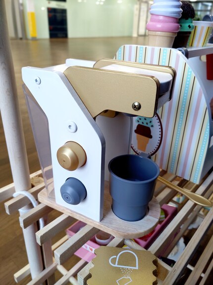 Ergänzend zum Eis bieten wir bei unserem Verkaufsladen Kaffee, Kuchen und Kekse an. Wir verwenden vor allem Artikel aus Holz. Sie sind zwar teuer, lassen die Eisdiele aber wertiger aussehen und unterstützen den gewünschten Look.