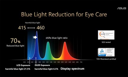 Dem ermüdenden, schädlichen Blaulicht sollen die OLED-Panels dank spezieller Technologie einen Riegel schieben. Dadurch soll das Blaulicht um 70 Prozent im Vergleich zu anderen Display reduziert werden. Das soll allerdings nicht zu Lasten der Bildqualität erreicht werden. Das Panel weicht auf ein alternatives Blau-Spektrum, das die farbgetreue Wiedergabe nicht beeinflussen soll.