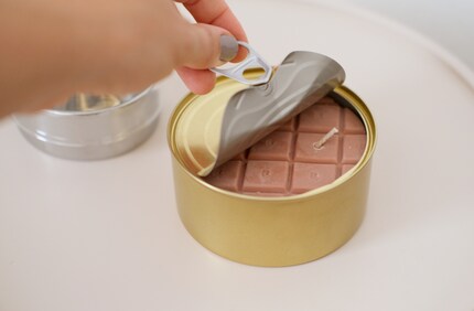 La bougie, encapsulée dans une conserve dorée, me rappelle les boîtes de thon ou encore de nourriture pour chat. En l'ouvrant, l'aspect ressemble à celui d'une tablette de chocolat. La cire en surface arbore un relief de carrés et une couleur marron.