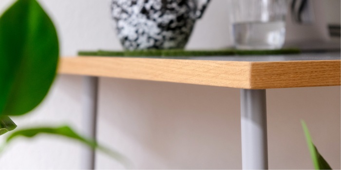 Quando si lavora, il piano del tavolo laminato è piacevole sulla pelle. Basta passare un panno umido per pulirlo. Journal è anche disponibile nei colori petrol, bianco o nero. Io sono contenta di aver optato per il grigio. Probabilmente avrei visto meglio le macchie di caffè sulla superficie bianca e le macchie di unto sul nero.