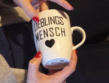 Als erstes wollten wir auf eine weisse Tasse einen Schriftzug kleben. Oben in der Bildstrecke (Foto 3) siehst du, wie das in der Software aussieht. Das Herz stammt aus den 100 gratis Designs aus der Bibliothek der Software. Beim Schriftzug haben wir zwei Textfelder gemacht, damit wir den Zeichenabstand beim Wort «Mensch» etwas weiter machen konnten und beim Wort «Lieblings» etwas schmaler, so dass die beiden Wörter bündig sind.