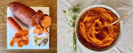 Alle Zutaten rüsten. Süsskartoffel und Rüebli in ca. 1cm grosse Stücke schneiden und alles zusammen im Babynahrungskochgerät dämpfen. 15 Minuten garen und anschliessend mit etwas Wasser mixen. Dieses Püree eignet sich auch super als Ersatzbeilage zu Kartoffelstock oder einfach so mit Salat. Du kannst deine Portion mit ein wenig Salz und Pfeffer würzen und je nach Geschmack mit Chili, gemahlenem Kreuzkümmel oder Curry abschmecken.