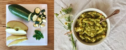 Zucchini rüsten und ca. 10 Minuten im Babynahrungskochgerät dämpfen. Anschliessend vollständig auskühlen lassen und zusammen mit der Minze pürieren. Den Apfel mit einer Röstiraffel zerkleinern und mit dem Zucchini-Minzepüree vermischen.