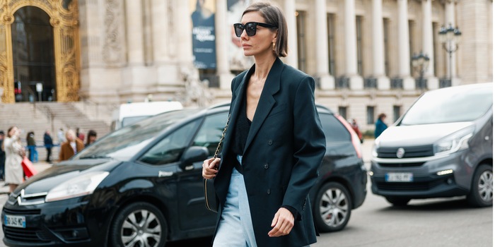Am liebsten kombiniere ich meinen Blazer mit einer Jeans, da ihm Denimstoffe die Strenge nehmen und ihm eine gewisse Coolness verleihen. Deshalb vermeide ich es, Sakkos mit (gleichfarbigen) Stoffhosen zu kombinieren – dieser Style funktioniert nur, wenn du dazu Sneakers trägst, die das Outfit auflockern. Da ich ungern bauchfrei herumlaufe, trage ich dazu eine Skinny-Jeans und Boots oder Sandalen. Wenn du darunter ein Cropped-Top trägst, kann die Hose einen Oversize-Schnitt (siehe oben) haben. Für den letzten Schliff sorgt eine Pilotenbrille.