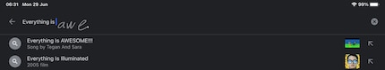 Ich beginne also in der Google App zu schreiben. Nach «Everything» wird mein gekritzel in Bildschirmschrift umgewandelt. Das Wort «Everything» steht also im Google Suchfeld. Nach «is» passiert dasselbe. Ich muss also nicht einmal mehr zwingend «Awesome» schreiben, denn Google schlägt mir das vor. Das bedeutet, dass die AI Googles und auch die des iPads wissen, was ich will. Oder was die meisten User wollen, wenn sie mit «everything is» anfangen. Ich kann also «awesome» so hässlich schreiben, dass knapp mal ein «a» erkennbar ist und iPadOS denkt sich «Yup, der Fall ist klar» und spuckt mir den Song aus «The Lego Movie» aus.