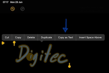 So schreibe ich, wenn ich Notizen mache. Ich bin im Territorium von «Ich kann das auch nicht mehr lesen, weiss aber, was ich schreiben wollte». iPadOS bietet mir «Copy as Text» an, also kann es irgendwas lesen. Es erkennt die Schrift als Schrift. Noch besser. iPadOS erkennt das Geschribsel als «Apple».
