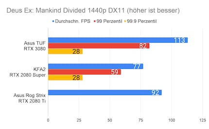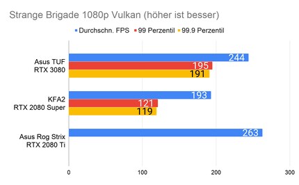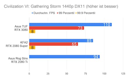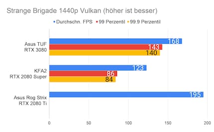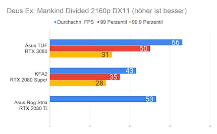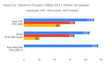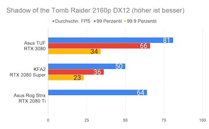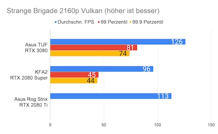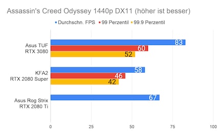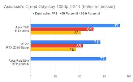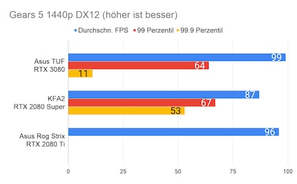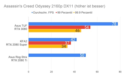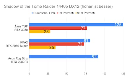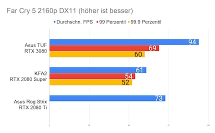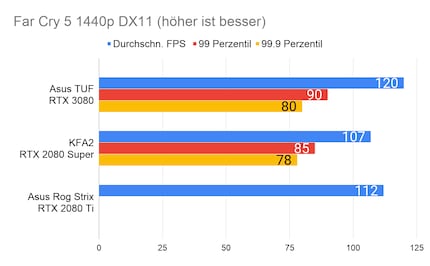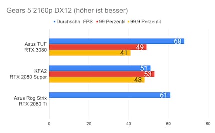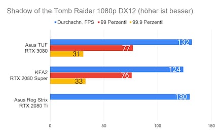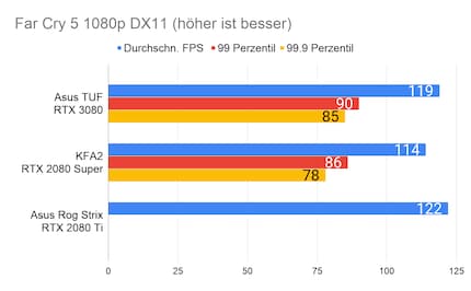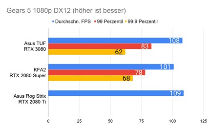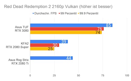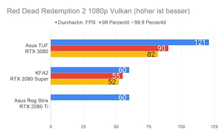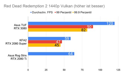 Bei den Games ergibt sich eine ähnliches Bild, das viele Reviewer bereits bei der Founders Edition gezeichnet haben: Die RTX 3080 glänzt vor allem in 2160p-Auflösung. In 1080p ist der Unterschied sehr gering, im Vergleich zur 2080 Ti manchmal gar nicht vorhanden. Enorm ist die Leistungssteigerung bei Red Dead Redemption 2. Falls du dich fragst, wieso bei der RTX 2080 Ti die Perzentilen fehlen: Ich habe beim Test damals die FPS noch anders erfasst. Leider musste ich die 2080 Ti an Asus retournieren, weshalb ich auch keine Nachtests machen konnte.