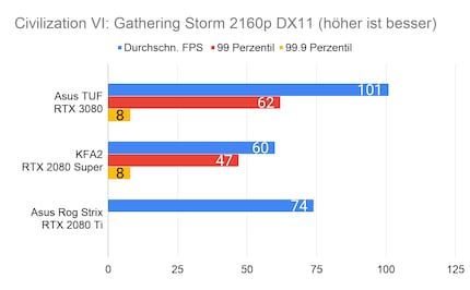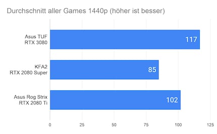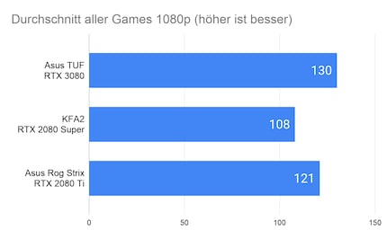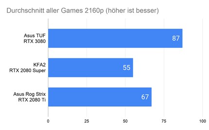 Bei 1080p-Auflösung liegen mit der 3080 im Vergleich zur 2080 Super rund 20 Prozent mehr FPS drin. Dieser Wert erhöht sich mit grösser werdender Auflösung. Bei 1440p sind’s 38 und bei 2160p gar 58 Prozent.