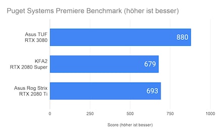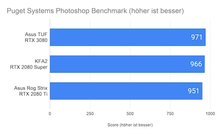 Die Testbench mit 3080er schneidet im Test zwar besser ab als die Testbench mit 2080 Super und 2080 Ti, der Unterschied ist mit 20 respektive 5 Punkten aber relativ klein. Die Leistung von Photoshop ist abhängig von der GPU, hier spielt aber der Takt eine grössere Rolle als die Anzahl Cuda Cores. Dadurch lässt sich das knappe Ergebnis erklären.