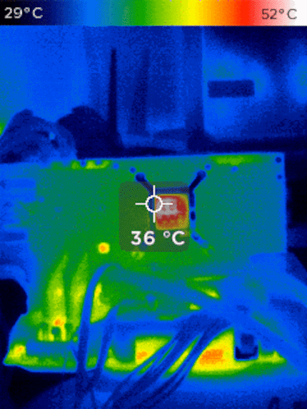 Die RTX 3080 wurde in Time Spy maximal 65° Celsius warm. Durchschnittlich waren es 61°. Da ich den Test auf der offenen Testbench gemacht habe, ist in einem Gehäuse mit höheren Werten zu rechnen. Hier die Wärmeentwicklung der Rückseite des PCB während des rund zweiminütigen Time Spy Demos:
