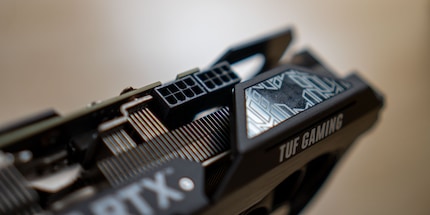 Die TUF ist vom Design her schlicht gehalten. RGBs findest du einzig vorne beim beleuchteten TUF-Logo. Sonst ist die Karte grau-schwarz. Asus spendiert der Karte eine Backplate mit TUF-Schriftzug. Im Gegensatz zur Founders Edition benötigst du bei der TUF keinen 12-Pin-Anschluss. Asus setzt auf zwei standardisierte 8-Pin-Anschlüsse.