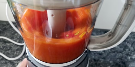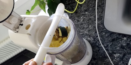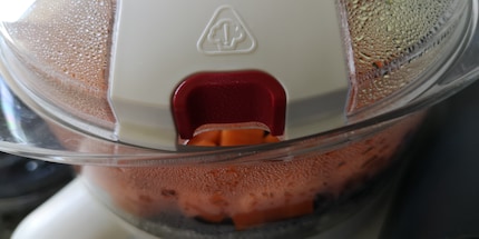 Nach dem Garvorgang kann ich den Inhalt des Korbs in die Schüssel mit integriertem Mixer geben. Damit ich mich dabei nicht verbrenne, kann ich den Korb mit dem mitgelieferten Spatel umschütten. Dann heisst es wieder: Deckel drauf zum Mixen. Gemixt wird, indem ich die Taste drehe statt drücke. Die Konsistenz des Breis beeinflusse ich durch die Dauer des Mixens und der Menge an Wasser.