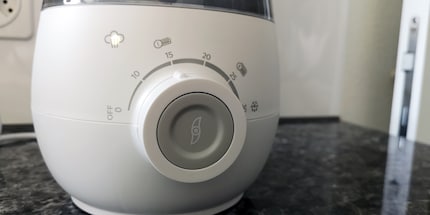 Etwas schwierig aufzusetzen ist der Deckel des Bechers. Aber mit etwas Übung geht’s auch einhändig. Dafür lässt sich der befüllte Behälter in der Dampfgarer-Funktion leicht aufsetzen. Die gewünschte Garzeit stelle ich über die Drehtaste ein. Nach Ablauf der Zeit piepst das Gerät. Durch ein Loch beim Klingenaufsatz entweicht der Dampf. Hier ist wie bei den anderen Geräten etwas Vorsicht geboten, wenn das Baby bei der Zubereitung dabei sein will.