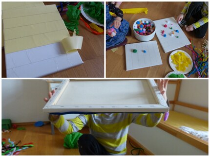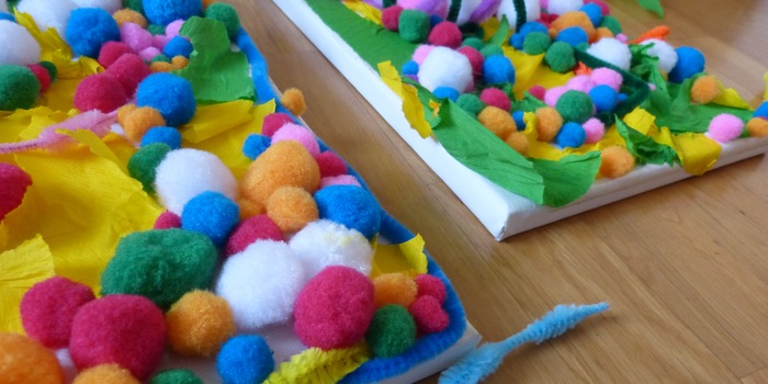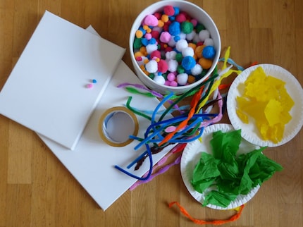 Für das Bild brauchst du eine Leinwand in der Grösse deiner Wahl, eine grosse Schüssel mit bunten Bastel-Pompons, Chenilledraht in verschiedenen Farben sowie farbiges Krepppapier.