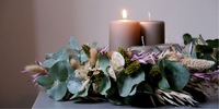 Das DIY ging dir zu schnell oder war zu einfach? Hier kommen zwei Alternativen, für die du mehr Zeit und Fingerspitzengefühl brauchst: Ein grosser Kranz aus Trockenblumen und einer, der aus vier einzelnen, mit Trockenblumen ummantelten Windlichtern besteht.