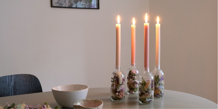 Du kannst die Kerzenhalter in einer Vierergruppe wie einen Adventskranz anordnen. Die Zahl der Kerzen wäre daran das einzig Klassische. Oder aber, du verteilst sie als Solisten in der Wohnung. So können sie ihren blumigen Charakter voll entfalten.