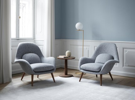 Die «Swoon Chairs» werden weitesgehend von Hand produziert, so dass du sie individuell gestalten kannst. Es gibt sie aus zahlreichen Stoffen von «Kvadrat» einem der grössten Textilunternehmen aus Dänemark sowie in unterschiedlichen Holzausführungen. Zuletzt hat der Modedesigner Raf Simons eine Stoffbezug-Serie namens «Harald» aus Samt entworfen. Der Sessel eignet sich für lauschige Wohnzimmer sowie für öffentliche Räume wie eine Bar oder eine Lobby.
