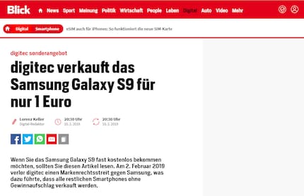 Digitec habe einen Rechtsstreit mit Samsung verloren und müsse deshalb die Restbestände des Samsung Galaxy S9 ohne Marge verkaufen. Dann beläuft sich der Preis des S9 laut Website auf einen Euro.