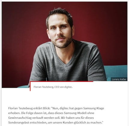 Oder ein Versuch, die Schweizerinnen und Schweizer zu betrügen. Die Website sieht täuschend echt aus, aber die Site, die auf den ersten Blick nach Blick aussieht ist ein Fake. Genau wie die Story auf der Seite. Den Rechtsstreit mit Samsung gibt es nicht, das Interview mit Florian Teuteberg, CEO der Digitec Galaxus AG, auch nicht.