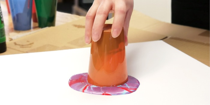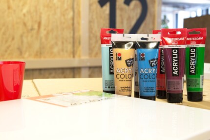 Den farbenfrohen Becher drehst du nun mit Schwung auf die Leinwand um und wartest, bis sich die zähflüssige Masse ausbreitet. Mit gezielten Kippbewegungen kannst du die Fliessbewegung beschleunigen und steuern. Dabei musst du aber mit Farbe an deinen Fingern und vielleicht auch an deiner Kleidung rechnen. Mir wird schnell bewusst, dass ich einige Farben etwas zu stark verdünnt habe, da sie sich zu gut mischen und sehr viel über meine Finger läuft. Dennoch ist das Bild noch nicht komplett mit Farbe eingedeckt. Das Becherspiel geht in die Verlängerung, dieses Mal mit weniger Wasser angereichert. Doch es hilft alles nichts: Die Farben passen nicht zusammen. Das Bild sieht aus, als ob ich die psychedelische Wirkung von LSD zu Blatt bringen wollte. Auch meine Arbeitskollegen lassen kein gutes Haar am Kunstwerk. Von der liebenswerten topografischen Karte von Norwegen bis «Erbrochenes in Acryl» ist alles dabei. Das kann ich aber nicht auf mir sitzen lassen.
