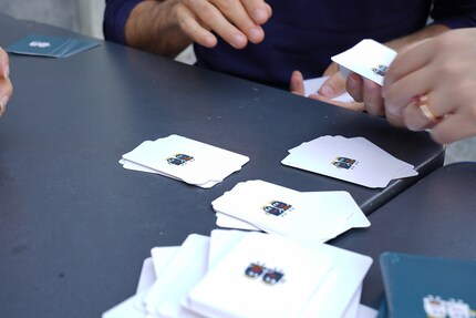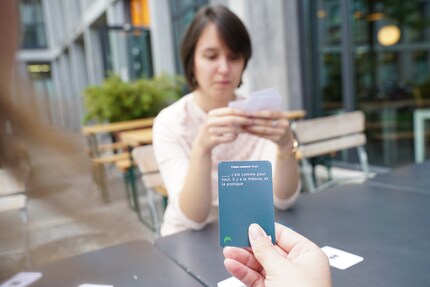 Entre midi et deux, Stéphanie, Sophie, Jean-François et moi nous asseyons dehors pour prendre l’air – mais pas que. On a découvert un jeu de cartes en français que nous voulons absolument tester et vous faire découvrir: «Blanc-manger coco».