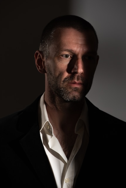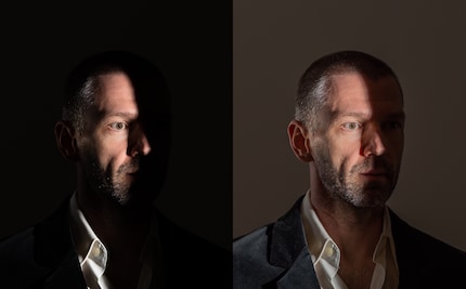 So einfach die Idee, so schwierig ihre Ausführung. Nur selten gelingt es, die Schattenlinie genau am richtigen Ort auf dem Gesicht zu platzieren. Bewege ich meinen Kopf nur wenige Millimeter, stimmt der Verlauf nicht mehr. Anders als bei einem Dauerlicht sieht Tom die Situation immer erst, wenn das Foto bereits geschossen ist. Testblitzen ohne Foto hilft ein wenig, aber nicht allzu viel.