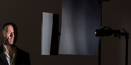 Die Grundidee ist simpel. Das Blitzgerät soll von schräg vorne ein hartes Licht erzeugen. Zwischen dem Blitz und meinem Gesicht wird eine schwarze Abdeckung so aufgestellt, dass nur ein Teil des Blitzlichts auf das Gesicht trifft. Durch die Abdeckplatte entsteht diese harte Kante, die senkrecht durch das Gesicht läuft.