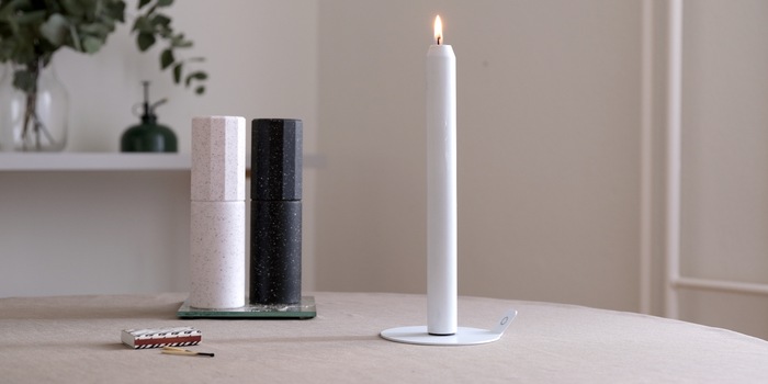 Der vier Jahre alte Entwurf von Lieke Van Dijk hat ein modernes und zugleich traditionelles Design. Er besteht aus einem röhrenartigen Halter aus Metall und kommt mit drei passenden Kerzen. Der Kerzenhalter ist bereits mit einer davon, sodass ich das Innenleben noch nicht erkunde. Optisch gleicht er einer Stabkerze und er hat auch Platz für eine mit einem Durchmesser von 16 bis 20 Millimeter. An der Unterseite des Halters befindet sich ein Magnet. Damit lässt er sich überall auf dem Unterteller anbringen.