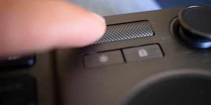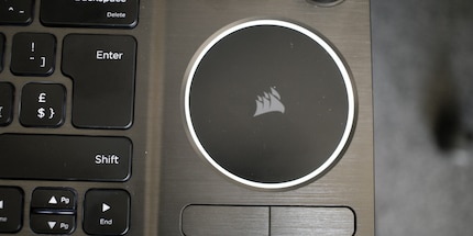 Die grauen WASD-Tasten heben sich von den anderen Tasten ab. Statt Zahlenblock befindet sich auf der rechten Seite ein rundes, kapazitives Touchpad inklusive linker und rechter Maustaste. Oberhalb des Pads gibt’s einen Joystick, einen Lautstärkeregler – der durch Druck auch als Mute-Taste fungiert –, eine Taste zum Einstellen der Hintergrundbeleuchtung und eine Funktionssperrtaste. Am Gehäuserahmen oberhalb des Joysticks befindet sich die L-Taste der Maus und auf der Rückseite des Gehäuses unterhalb der L-Taste liegt die R-Taste.