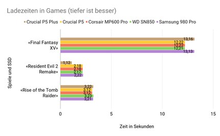 Die P5 Plus fällt bei der Ladezeit bei «Final Fantasy XV» im Vergleich zu den anderen etwas ab. Bei «Rise of the Tomb Raider» liegt die Crucial-SSD hingegen bei den anderen. Einzig bei «Resident Evil 2 Remake» liegt sie ganz vorne. Die Unterschiede sind jedoch in allen Fällen gering und werden im Alltag nicht gross auffallen.