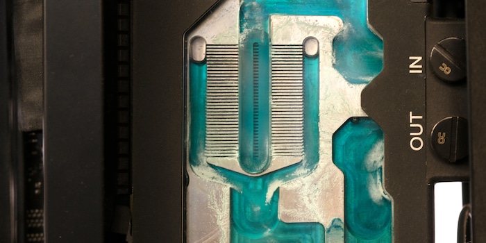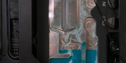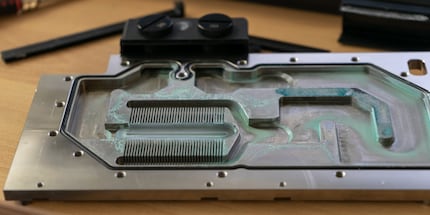 Igitt. Der GPU-Block der 1080 Ti ist mit Kalk durchsetzt. Dabei müsste der Wasserzusatz genau dem vorbeugen. Da ich sowieso herausfinden will, wieso unser Gaming-PC nicht mehr läuft, schaue ich mir den Block etwas genauer an.