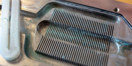 Das sieht einiges wilder aus als auf dem GPU-Block. Und beim CPU-Block sind die Lamellen viel dichter beieinander. Das wird schwierig zu reinigen. Ich gehe zunächst gleich vor wie beim GPU-Block. Nachdem ich das Gröbste weggemacht habe, nehme ich eine feine Bürste und tränke diese im Brennsprit. So reinige ich zwischen den Finnen. Es kommt noch so einiges aus den schmalen Rinnen raus.