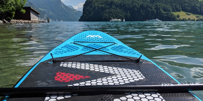 Trotzdem bin ich zufrieden mit meiner Wahl. Ich bin mir bewusst, dass es sich beim Aqua Marina Vapor um ein Einsteiger-Modell handelt und die grossen Preisunterschiede zu Premium-Boards nicht nur durch die Markennamen zu erklären sind. Auch wenn sich die Schlagworte in den Beschreibungen gleichen, ist das nicht mit gleicher Qualität zu verwechseln. PVC ist nicht gleich PVC. Und die Dropstitch-Technik, durch die Ober- und Unterdeck bei aufblasbaren Boards miteinander verbunden werden, kann langlebig, dicht und steif oder einfach nur billig gemacht sein. Dass ein «doppelwandiger Kern» in günstiger Ausführung auf Dauer mit den Top-Materialien teurer Boards mithalten kann, ist ebenso unwahrscheinlich.