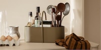 Schneidebretter und flache Dinge lehnst du an die Rückwand und machst sie zum Rahmen für beispielsweise einen ansehnlichen Krug. Oder du mischst das Arrangement mit einigen Kochbüchern und Bilderrahmen auf. Drehe ein Buch zur Abwechslung auch mit dem Cover in die Richtung des Betrachters. Nur beim Anordnen von Tassen solltest du nichts vermischen: Entscheide dich zu Beginn, ob du sie kopfüber oder umgekehrt ineinandersteckst. Dieselbe Art zu stapeln wirkt optisch harmonischer. Plane auch Abstände und Ruhezonen zwischen den Stapeln ein. Besonders hübsche Dinge kannst du wie eine Kirsche auf die Sahnetorte setzen.