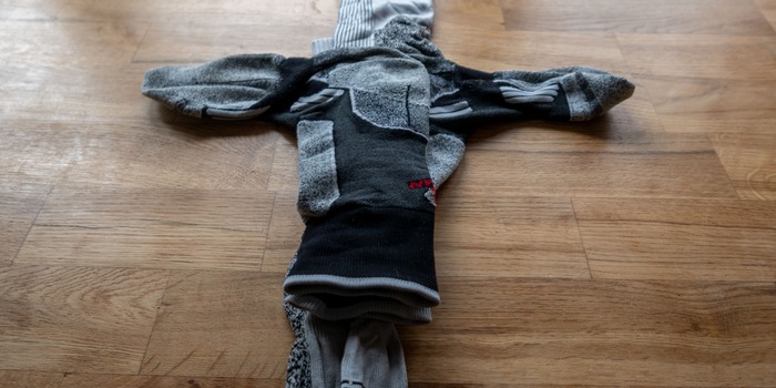 Exakt eine Stunde, neun Minuten und vierzig Sekunden später bin ich auch nicht schlauer. Es herrscht Ruhe, der Akku der Backgym ist leer. Und die Socke ist heiss gelaufen. Nach gerade einmal 236 844 simulierten Schritten finde ich zwei Löcher darin.