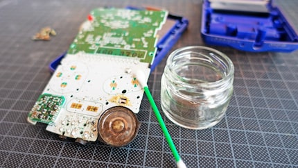 Typischerweise ist der Lautsprecher am meisten verschmutzt. Der braunen Kruste gehe ich mit Reinigungsalkohol an den Kragen. Das gereinigte Board lege ich danach erstmal zur Seite.