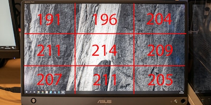 Dafür ist das Display gleichmässig ausgeleuchtet. Maximal 23 Nits Differenz messe ich. Es leuchtet in der Mitte am hellsten und fällt oben sowie oben links leicht ab. Von blossem Auge ist das jedoch nicht zu erkennen. Die auf dem Papier versprochenen 250 Nits erreiche ich bei der Messung zwar nicht, dank der Entspiegelung kann ich dennoch mit dem Fenster im Rücken am ZenScreen arbeiten.