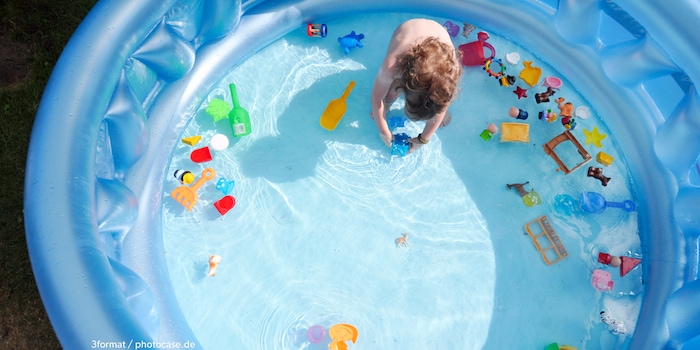 Für Babys bietet sich ein Planschbecken mit Dach an. So sind die Kleinen beim Baden ideal vor der Sonne geschützt. Den faltbaren Pool kannst du auch drinnen aufstellen – einfach mit Bällen gefüllt.