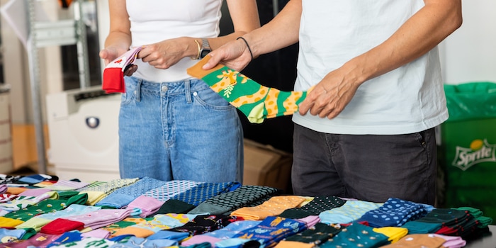 Sean Pfister: Restposten verkaufen sich nicht besonders gut. Darum haben wir vor etwa drei, vier Jahren dieses Projekt gestartet – auf die Idee brachte uns eine Kundin. Wir haben unterschiedliche Werkstätten gesucht, die Menschen mit Beeinträchtigungen beschäftigen oder solche, die wieder integriert werden sollen. Ihnen schicken wir unsere Überbleibsel und Ladenhüter und sie schenken ihnen mit den Socken-Affen ein zweites Leben.
