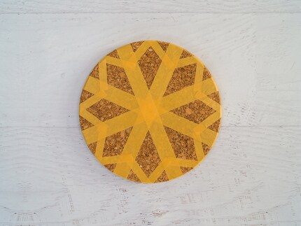 1. Klebe das Klebeband erst zu einem Kreuz und mit zwei weiteren diagonalen Streifen zu einem Stern auf den Kork. Halbiere das Klebeband mittig und klebe die dünnen Streifen aussen an den Zacken fest. Achte darauf, dass das Klebeband vollständig auf dem Kork liegt, damit die Farbe nicht darunter fliessen kann.