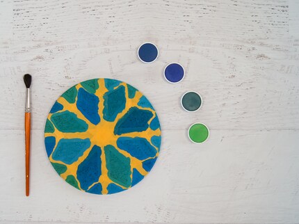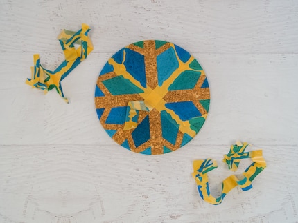 Alle anzeigenDie Vorbereitung ist das A und O. Es lohnt sich, vorab alles grosszügig mit Altpapier abzudecken, eine Schürze zu tragen und einen feuchten Lappen für alle Fälle bereit zu halten. Kleinkinder können teils die Felder noch nicht einzeln ausmalen. In diesem Fall können sie über den gesamten Kork malen und den Untersetzer einfarbig gestalten. Der Effekt kommt trotzdem zur Geltung, wenn sie das Klebeband abziehen. Falls dein Kind mit der Pinselhaltung noch Probleme hat, kann die Farbe auch mit einem Schwamm aufgetragen werden.