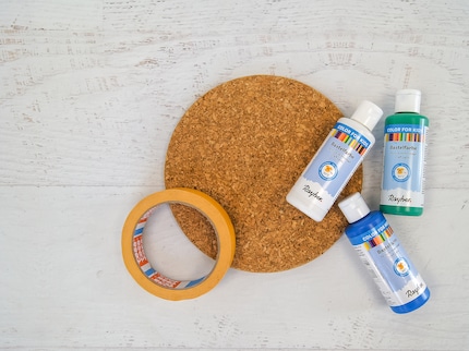 Als Basis brauchst du einen Korkuntersetzer und ein Klebeband. Hinzu kommen verschiedene Bastelfarben und ein Pinsel oder Schwamm, um die Untersetzer zu bemalen.