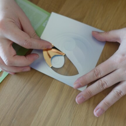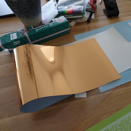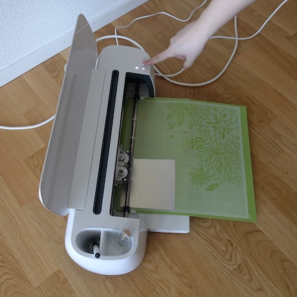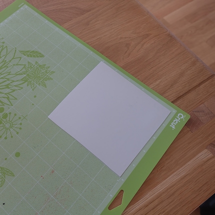 Dieses Rechteck legst du auf eine Schneidplatte in den Hobbyplotter. Die Trägerfolie (das ist die glänzende Seite) zeigt nach unten. Jetzt lässt du das Gerät die Arbeit machen.
