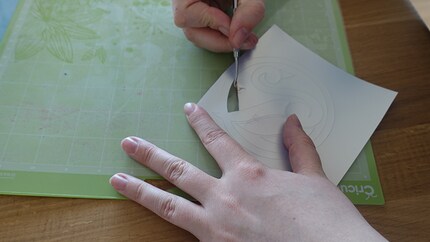 Mit einem Plotter-Spaten löst du vorsichtig die unnötigen Freiräume aus dem Sticker heraus. Hier ist Fingerspitzengefühl gefragt und je nach Print etwas Geduld.