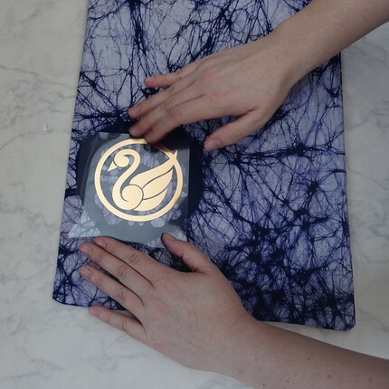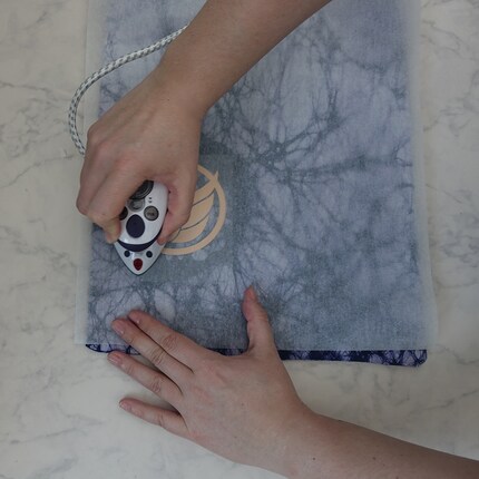 Alle anzeigenUm Falten und Restfeuchtigkeit aus dem Stoff zu entfernen, bügelst du als Erstes den Stoff kurz auf. Nun platzierst du das Sujet mit der matten Seite nach unten auf den Stoffbeutel oder ein Kleidungsstück deiner Wahl. Dann deckst du das Ganze mit einem Abdeckbogen ab. Lege das Textil nicht auf ein gepolstertes Bügelbrett, sondern auf eine Granit oder Holzplatte. Dort presst du das Bügeleisen zehn Sekunden lang auf die Folie. Sei vorsichtig, es besteht die Gefahr, dass du das Motiv ungewollt verschiebst. Anschliessend lässt du das Ganze kurz abkühlen, bevor du die Folie behutsam abziehst. Zum Schluss presst du den Abdeckbogen nochmals einige Sekunden lang von Hand an, damit das Sujet bombenfest auf dem Stoff haftet.