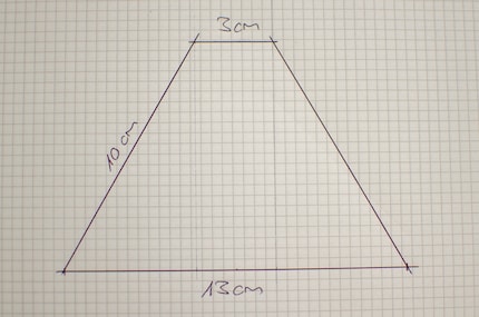 Nehme dir zuerst ein Stück Papier zur Hand und zeichne die Vorlage gemäss dem Foto ab. Die Abmessungen des Trapezes sind unten 13 cm, oben 3 cm und auf der Seite 10 cm. Nachdem du die Zeichnung erstellt hast, kannst du das Trapez mit einer Schere ausschneiden.