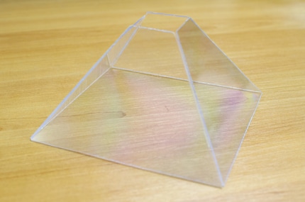 Im nächsten und bereits letzten Schritt fügen wir die Trapeze zusammen. Lege dazu die einzelnen Seiten bündig zueinander und verbinde sie mithilfe eines durchsichtigen Klebebandes. Um die letzten beiden Seiten zu verbinden, stellst du dein Modell zu einer Pyramide auf und verklebst das erste und letzte Trapez miteinander.