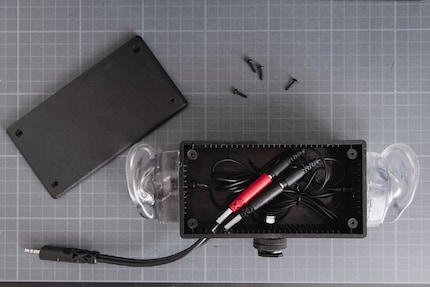 Beim ABS-Gehäuse bohre ich seitlich je ein Loch und auf der Unterseite zwei weitere Löcher. Bei den seitlichen Löchern wird später das Lavalier-Mikrofon durchs Silikonohr nach aussen gelangen. Das mittlere Loch ist für einen Aufsteckfuss reserviert. Nun stecke ich die Lavalier Mikrofone im Gehäuse an den Splitter und ziehe das Endstück durch das letzte Loch an der Unterseite nach aussen. Um die Silikonohren am ABS-Gehäuse anzubringen suche ich einen passenden Leim. Das ist nicht einmal so einfach. Nach mehreren Fehlversuchen lass ich mich in der Modellbauabteilung von Schaufelbergers Warenhaus beraten. Die Lösung für mein Problem liegt beim Material. Sie empfehlen mir Silikonkleber. Hört sich logisch an und funktioniert auch. Die Ohren halten. Das Gehäuse verschliesse ich mit den vier beiliegenden Schrauben und fertig ist das binaurale Mikrofon.