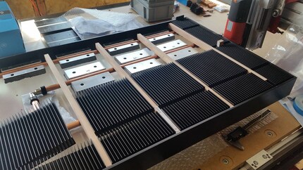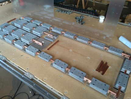 Im Dezember 2018 – über ein Jahr nach seinem letzten Log-Post – meldet sich Philipp zurück und erklärt, was in der Zwischenzeit alles gelaufen ist. Er baut die Kühlanlage fertig. Da Standard-Kupferrohre nicht perfekt in die Bodenheizplatten passen, hat er Kupferteile gefertigt, damit die Rohre sicher sitzen und die Wärme besser abgeben. Beim Montieren der anodisierten Aluminiumkühlkörper stellt sich heraus, dass die Kupferrohre in der Höhe nicht vollständig in den Bodenheizplatten verschwinden. Die Kühlkörper liegen somit nicht ganz flach auf den Heizplatten. Deshalb fräst er hinten eine Rille in die Kühlkörper. Jetzt liegen sie flach auf und er kann alles auf der Glasfaserplatte montieren. So hat er immer wieder mit Problemen zu kämpfen.
